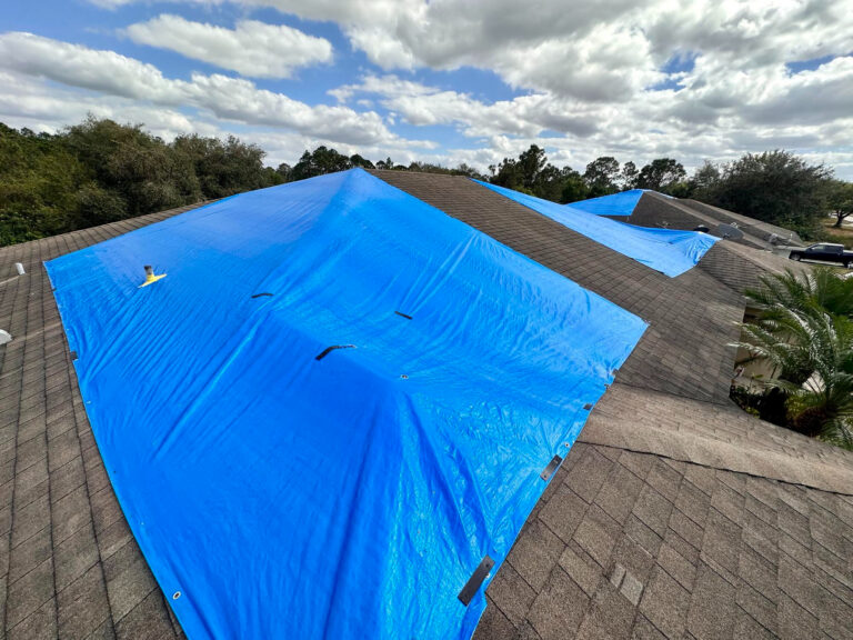 Le bâchage ne consiste pas seulement à poser une protection : il faut assurer sa résistance aux vents et sa parfaite étanchéité pour ne pas aggraver la situation.